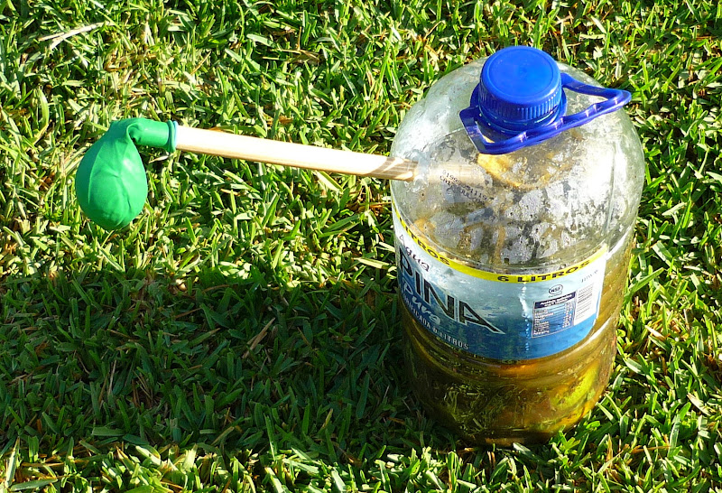 Luego--aunque se podría hacer previo a pegar la manguera con el contenedor--se pusieron dos globos inflables (uno dentro de otro para evitar que un hollo en el globo sirva de fuga de gas) y envolvieron con su cuello el otro extremo de la manguera (como es demostrado en la fotografía).